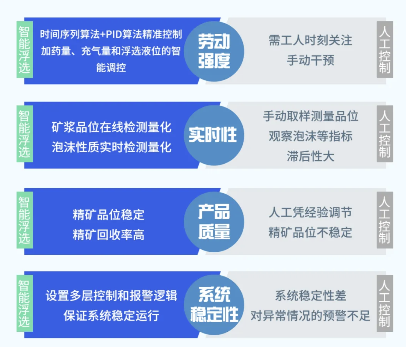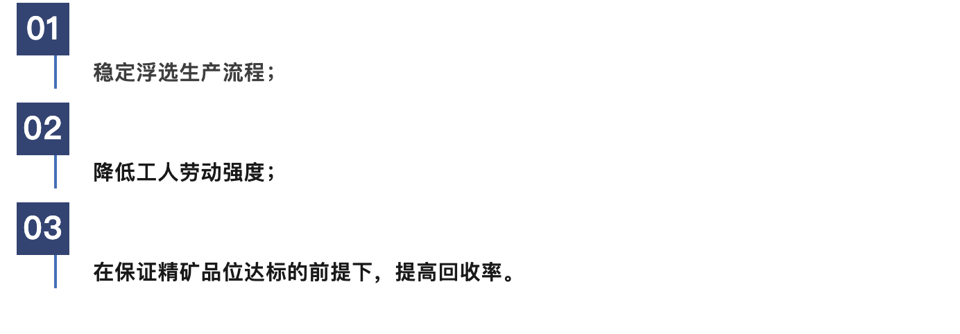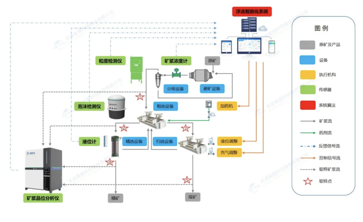 智能浮選全面解決方案,依托礦漿品位分析儀和泡沫分析儀等先進(jìn)的分析儀器,實現(xiàn)礦漿品位的在線檢測和泡沫性質(zhì)的實時量化;通過液位計、流量計、濃度計等儀表,實時監(jiān)測浮選機(jī)液位、礦漿流量、礦漿濃度和充氣量等關(guān)鍵數(shù)據(jù);通過加藥機(jī)、電控閥門、氣控閥門等執(zhí)行機(jī)構(gòu);配合先進(jìn)的控制邏輯和算法,實現(xiàn)加藥量、充氣量和浮選液位的智能調(diào)控,達(dá)到減少人工干預(yù),降低生產(chǎn)成本,穩(wěn)定精礦品位,提高精礦回收率的目的。